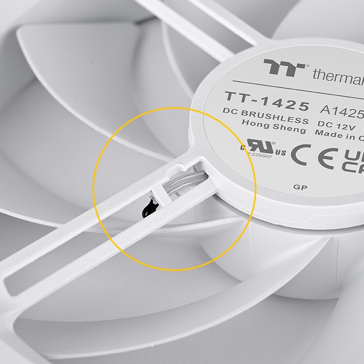 TS EX RGB白色版在風扇背面內建溫度感測器,提供額外的轉速控制。感測器能即時監測風扇附近的氣流溫度,根據區域條件進行動態轉速調整。