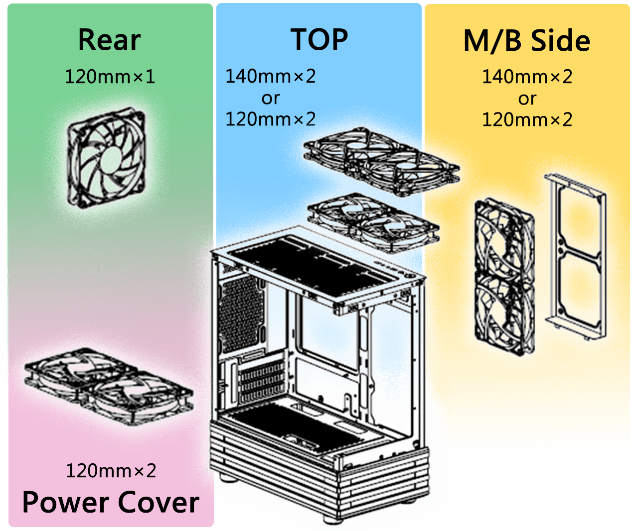 Top: 2 x 120mm, 1 x 120mm 2 x 140mm, 1 x 140mm Right: 2 x 120mm, 1 x 120mm Rear: 1 x 120mm Power Cover: 2 x 120mm, 1 x 120mm |