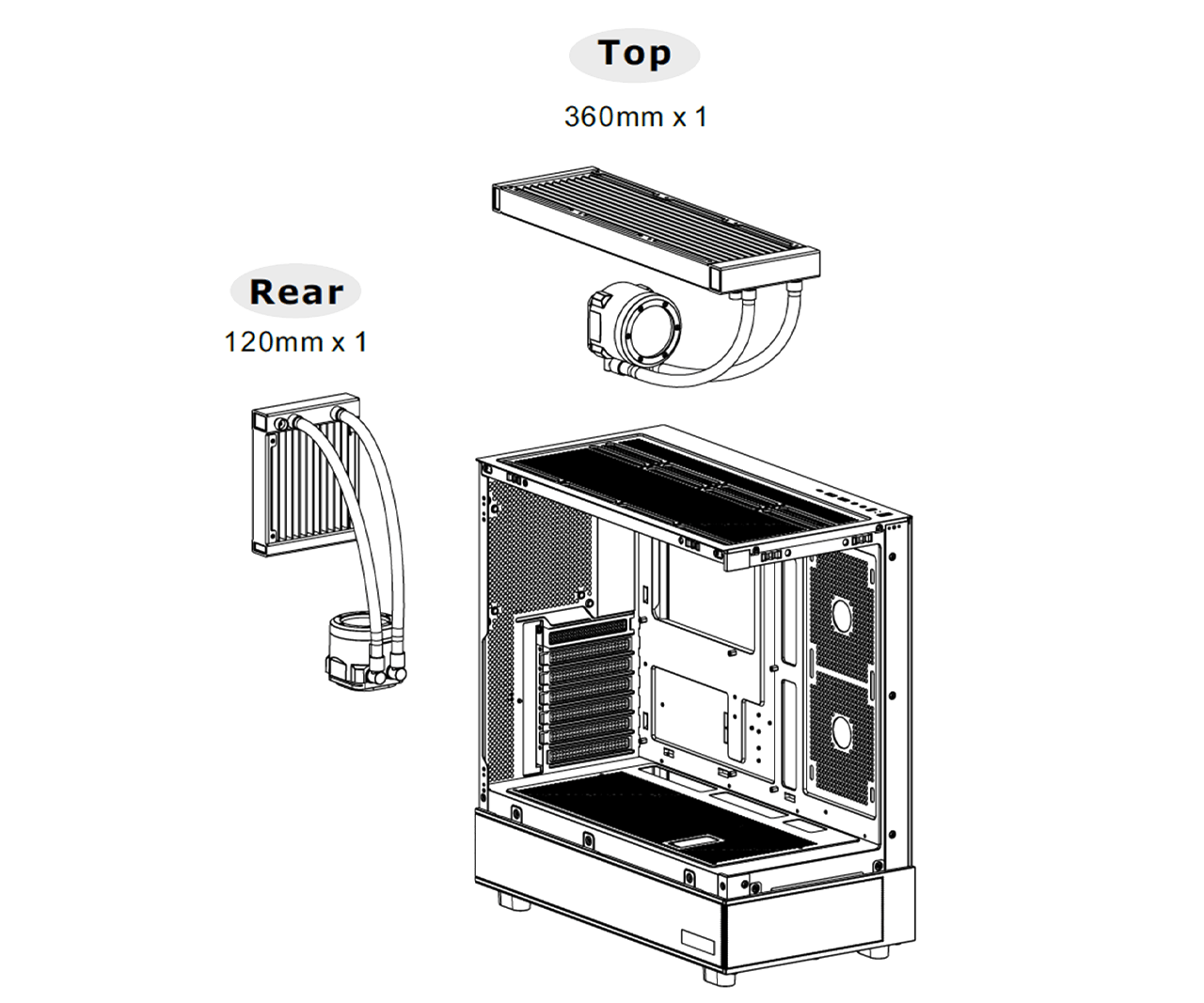 Top: 1 x 360mm, 1 x 240mm, 1 x 120mm Rear: 1 x 120mm |